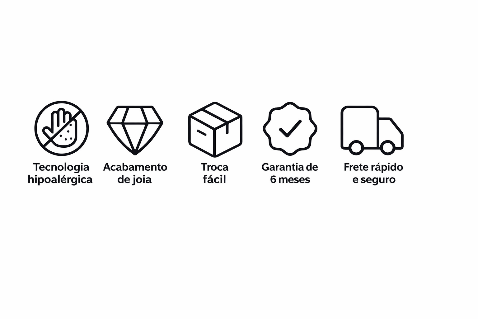 Nossas semijoias banhadas a Ouro 18K E Ródio Branco são cuidadosamente projetadas para serem hipoalergênicas e oferecer o máximo de conforto aos nossos clientes. Ao utilizar uma composição livre de níquel e outros metais pesados durante o processo de produção, garantimos um baixíssimo potencial de causar alergias na pele.